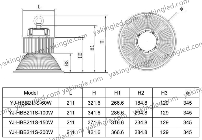 | YJ-HBB211S-200W | 200W | 21000-23000LM | Φ211*156mm |